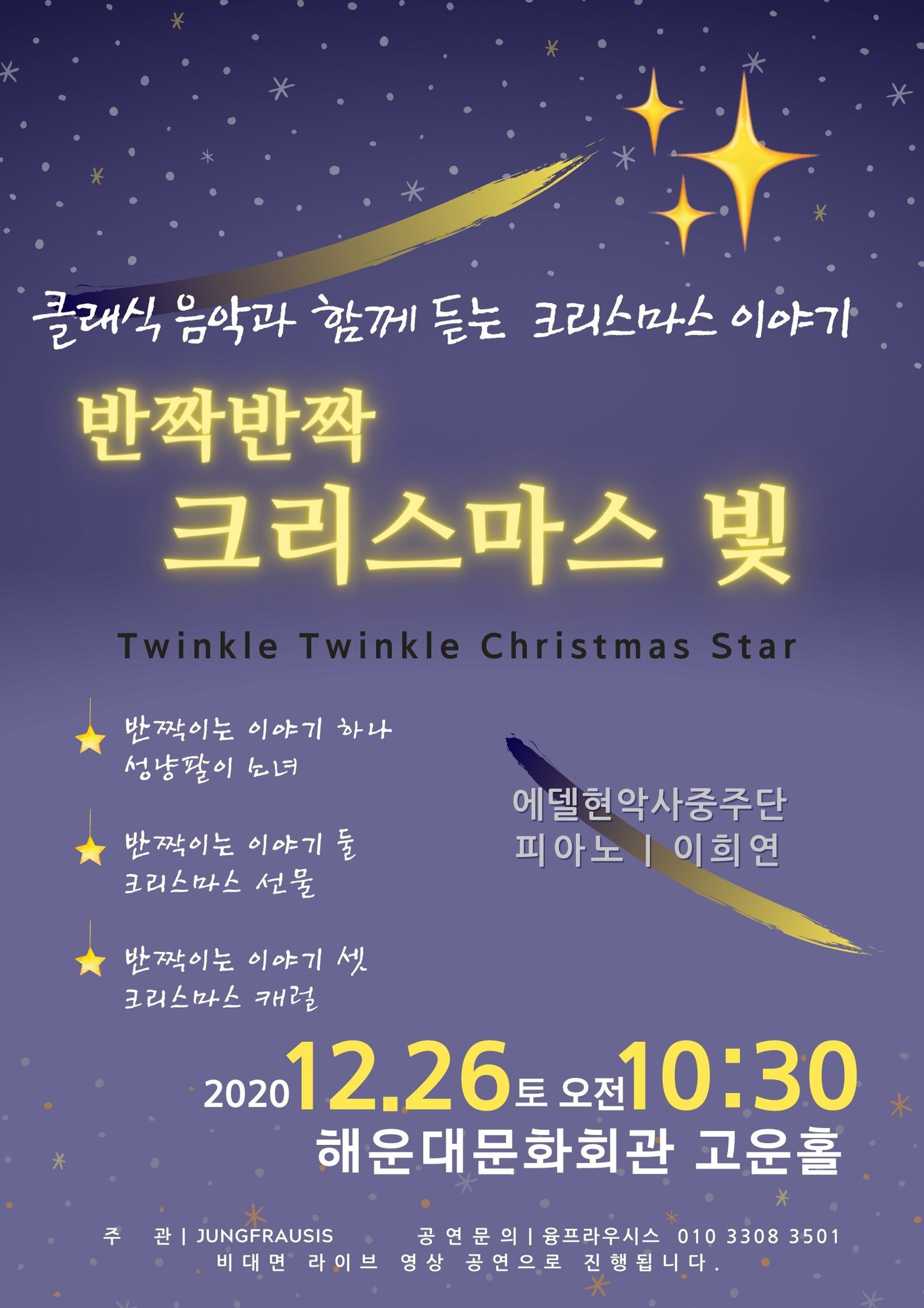 거리마다 아름다운 조명으로 수 놓이는 계절을 맞이하여 자매 공연기획사인 '융프라우시스'가 반짝이는 크리스마스 공연을 준비했다. 클래식 음악과 함께 듣는 크리스마스 이야기 ‘반짝반짝 크리스마스 빛’은 시대를 초월하여 우리 마음 속에 빛나는 이야기 세편을 에델현악사중주단과 피아니스트 이희연의 연주와 더불어 전달한다.